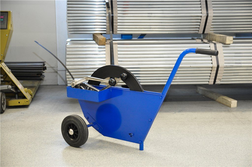 En bandvagga för enkelspolat stålband i bredden 16–19 mm med rymligt fack för bandverktyg och tillbehör. Pulverlackerad i blå med 2 solida 200 mm gummihjul och enkel spolbytning.