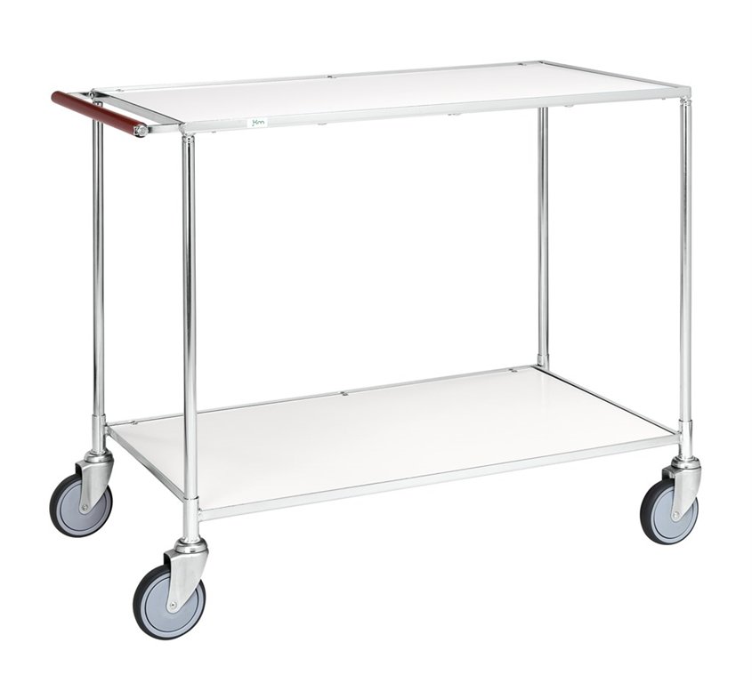 En bredare bordsvagn med laminatskiva. Inplastat handtag blir varmare att hålla i.