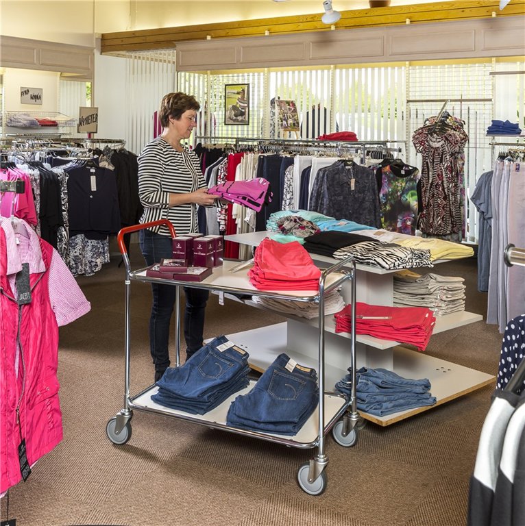En bredare bordsvagn med två laminathyllplan och plastat handtag – passar verksamheter som behöver mer lastyta och god framkomlighet.