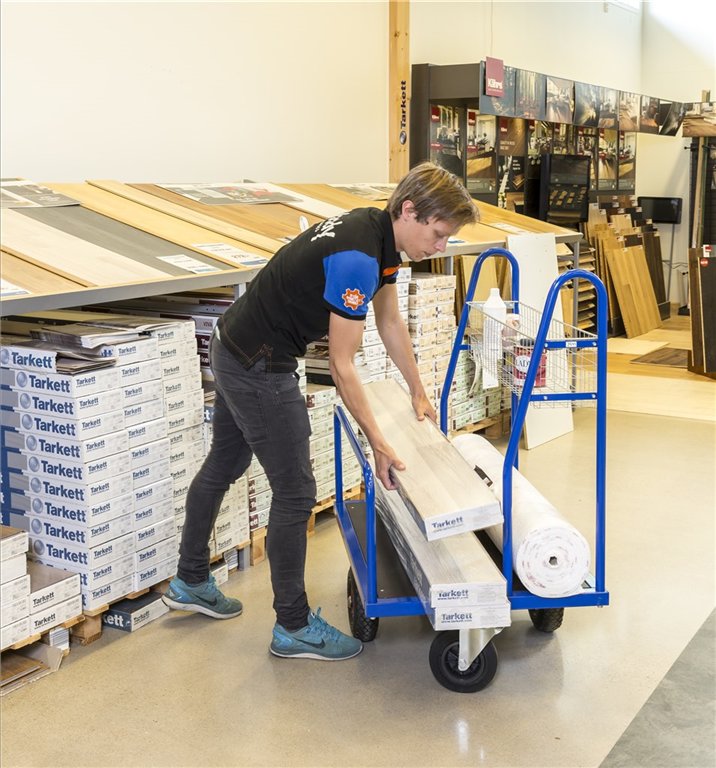 En robust byggvaruvagn i blå med 500 kg lastkapacitet och stora 260 mm luftgummihjul för god framkomlighet.