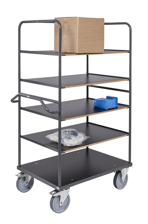 En kraftig ergonomisk hyllvagn med 5 hyllplan, ergonomiska handtag, bromsade hjul och mörkgrå lackering. Byggd för tung och frekvent användning i industri och lager.
