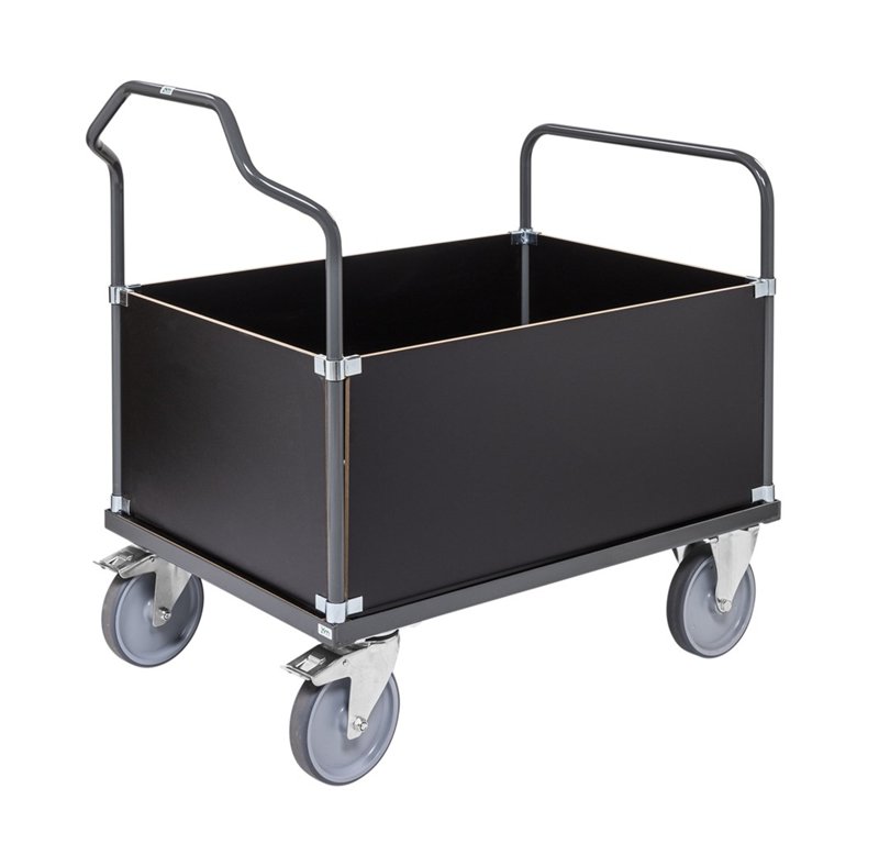 En kraftig lådvagn ur Serie 300 ERGO med ergonomiskt handtag, bromsade hjul i mörkgrå.