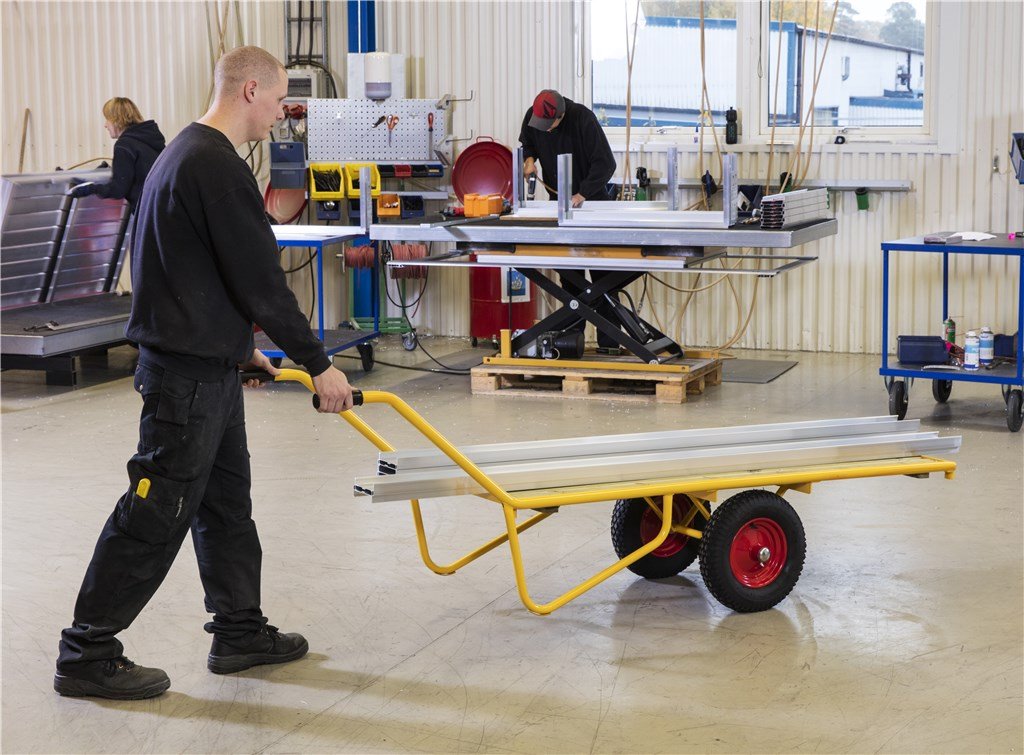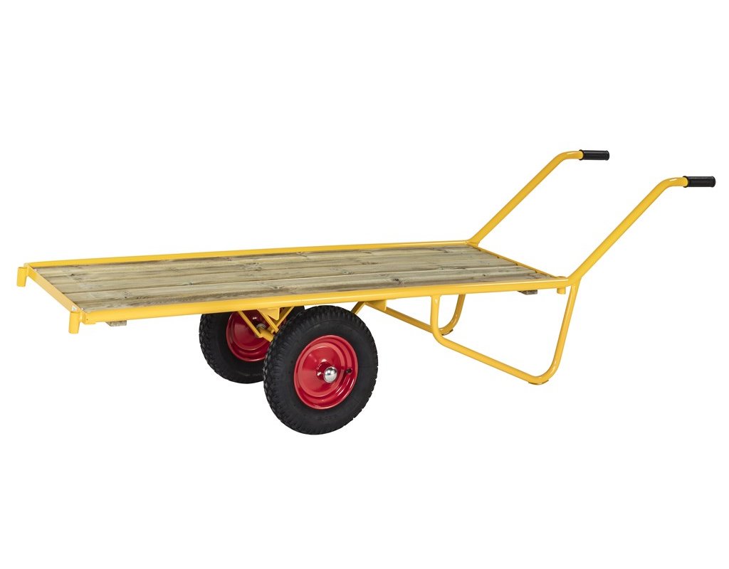 En perrongkärra med flak av tryckimpregnerade brädor, gul pulverlack och stora 400 mm luftgummihjul. Bredden på 615 mm är anpassad för att ta sig genom vanliga dörröppningar, med 400 kg lastkapacitet.