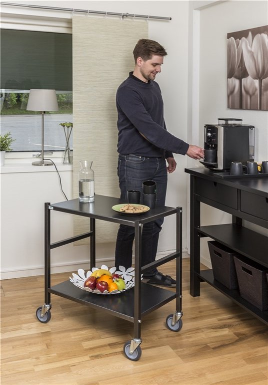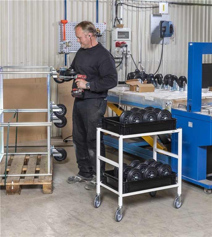 Ett smidigt rullbord med 2 hyllplan som kan monteras med kant upp eller ner – anpassat för standardbackar på 600x400 mm och finns i fem färger.