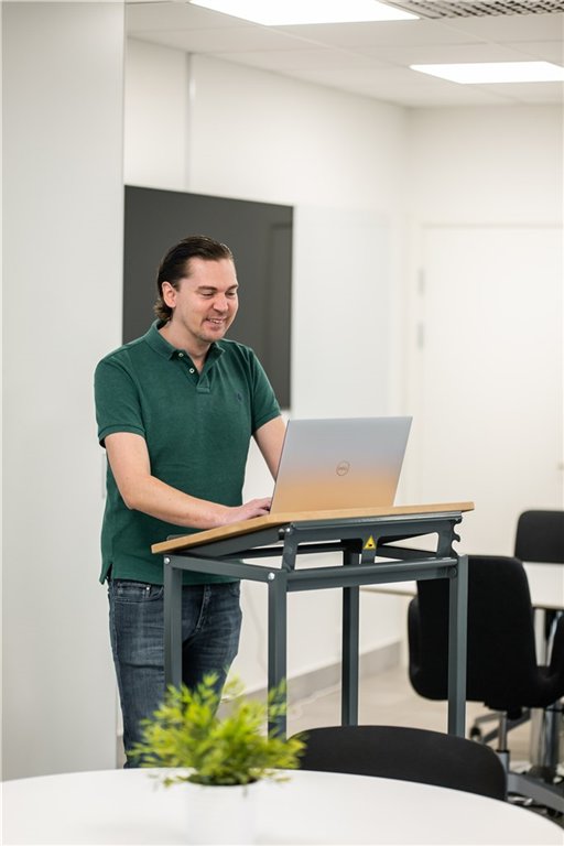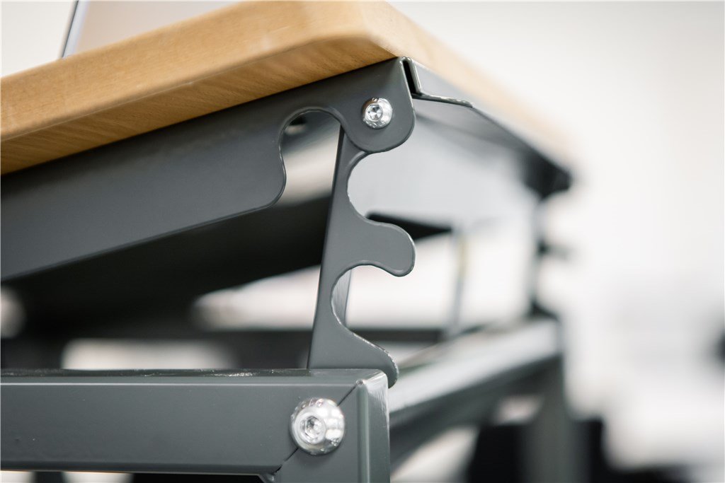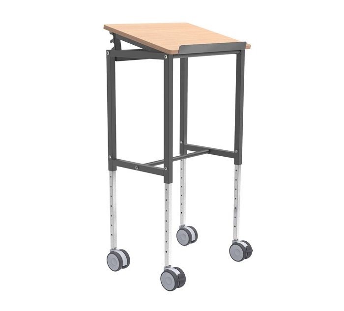 Ett höjdjusterbart ergonomiskt rullbord med mörkgrå stomme och hyllplan i bok eller grå.