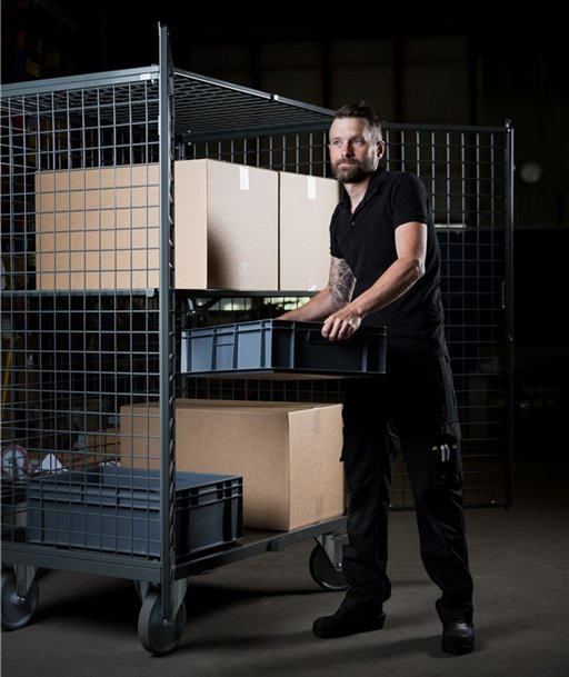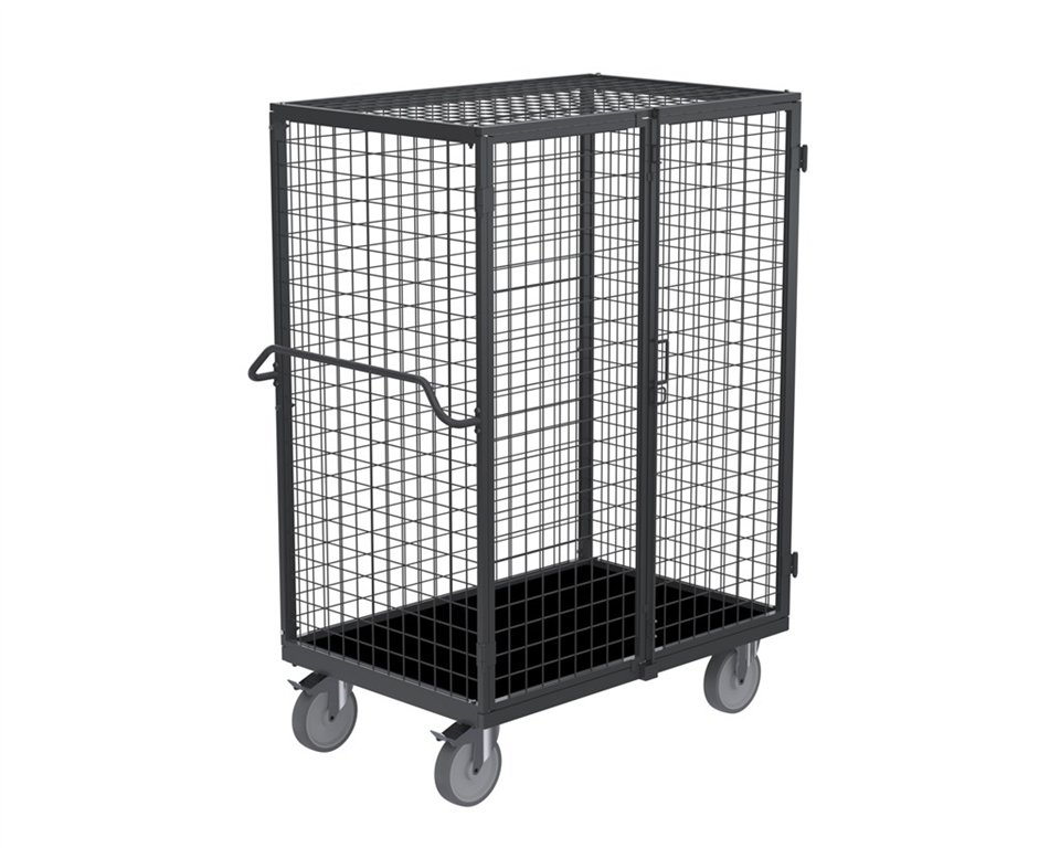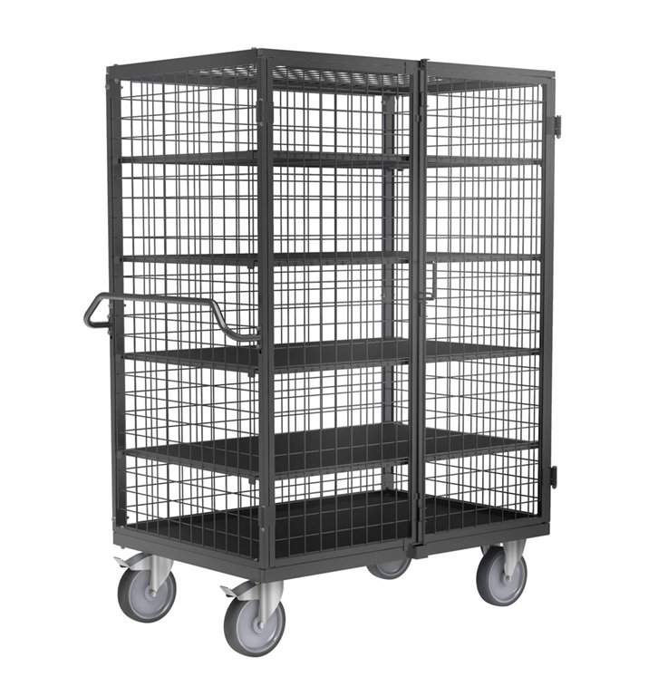 Säkerhetsvagn med gallervägg och öppet innermått på 1160 x 760 x 1440 mm – 500 kg lastkapacitet och 200 mm hjul med broms. Hyllor beställs separat som tillbehör.