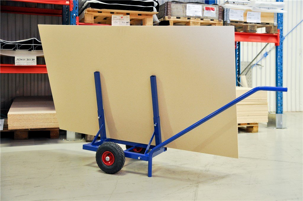 En stabil skivvagn med öppet lastplan och gummimatta som håller materialet på plats. Utformad för enkel hantering av skivor, paneler och platt material i verkstad, lager eller butik.